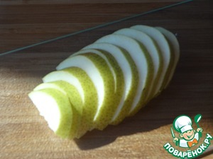 Вымойте грушу. Разрежьте пополам, выньте середину. Далее нарежьте половинки груш поперек. Если груши небольшие, то лучше нарезАть вдоль. Толщина - произвольная, но не тоньше полусантиметра.