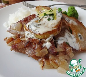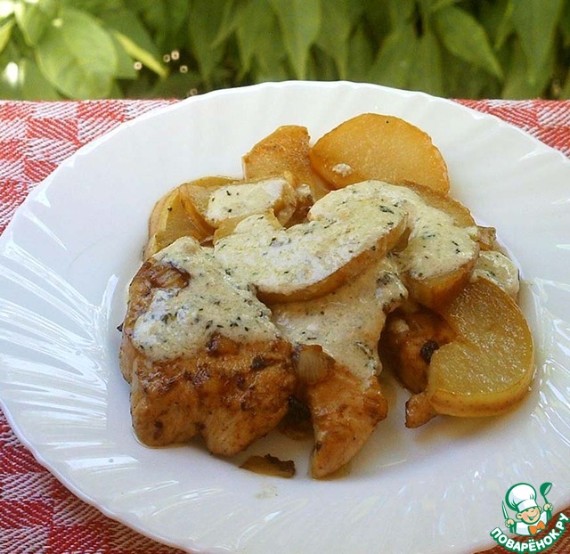Можно немного изменить блюдо. И соус готовить вместе с мясом. Для этого мясо, обжаренное с луком заливаем вином, добавляем сметану и эстрагон. Тушим минут 5. В этом случае можно использовать эстрагон сушеный, а мясо следует резать мельче.