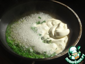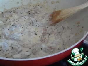 Одновременно влейте в сотейник вино, выпаривайте его несколько минут, добавьте нарезанный эстрагон и сметану. Проварите еще минутку. Посолите и поперчите по вкусу.