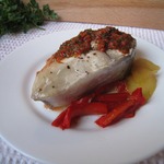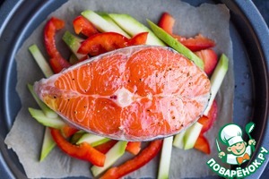 Перец разрезать пополам, очистить от семян и белых прожилок. Половину оставляем на соус, половину нарезать длинными брусочками. Кабачок или цуккини помыть и тоже нарезать длинными брусочками. Рыбу помыть и обсушить бумажным полотенцем, натереть солью. В форму выкладываем пекарскую бумагу или пергамент, сверху выкладываем подушку из овощей, солим. На овощи кладем рыбу, перчим и сбрызгиваем оливковым маслом. Ставим в духовку на 30-40 минут при температуре 120С.