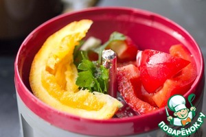 Пока рыба с овощами запекается, приготовим соус. Для этого в чаше блендера смешиваем оставшуюся половину болгарского сладкого перца (произвольно нарезать), листики петрушки (можно заменить на кинзу), оливковое масло, соль, перец и апельсиновый сок.