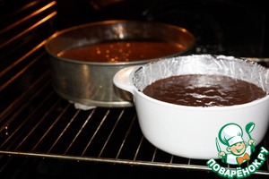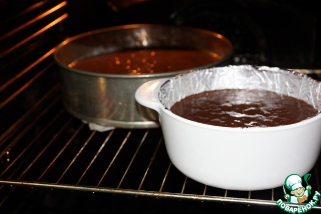 Так как у меня два пирога и только одна разъемная форма, то я использовала керамическую кастрюльку, застелив ее фольгой и смазав так же маслом. Кстати, корж получился весьма удачным и проблем с выниманием у меня не возникло никаких. -