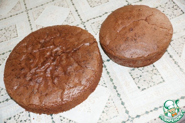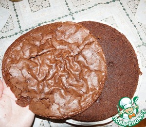 Пока начинка застывает, у остывшего коржа срезать сверху тонкий слой.