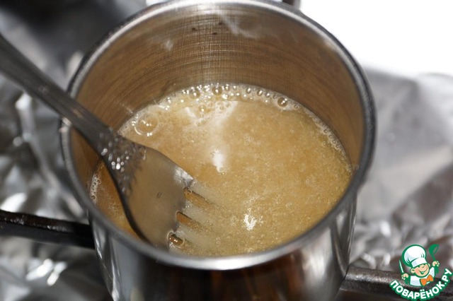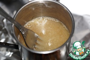 Желатин всыпать в небольшое количество воды (примерно 50 мл.) и нагреть на маленьком огне, помешивая вилкой до полного растворения желатина. Не доводить до кипения! -