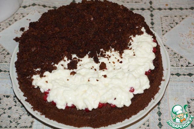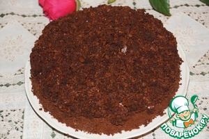 Присыпать сверху крошками пирога, прижимая их пальцами, чтобы не распадались, а плотно прилегали к сливкам, образуя одно целое.