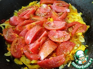 Когда овощи станут прозрачными (не зажарьте!), кладем к ним помидоры, солим, перчим, накрываем крышкой и слегка тушим.