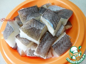 Филе палтуса нарезаем крупными кусочками, посыпаем чуть солью.