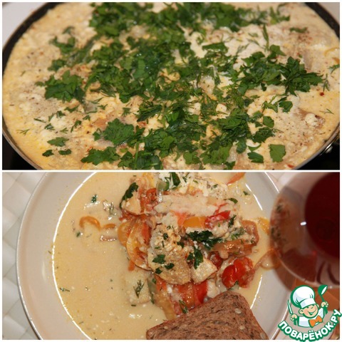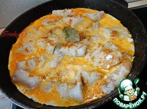 Кладем лавровый листик и заливаем сметаной, разбавленной с теплой водой (всего жидкости должно получиться 250 мл).
