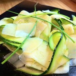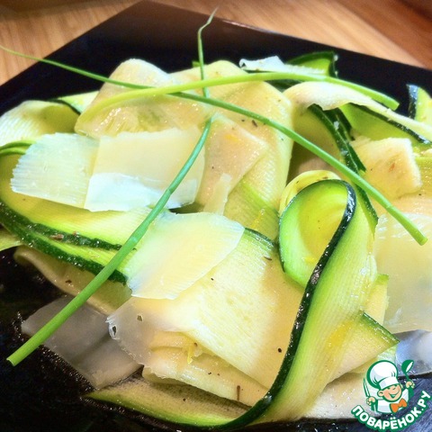 Кабачок цуккини в его лучшем виде - сырой, со всеми своими витаминами и минералами, не тронутыми тепловой обработкой. Никакой грубой жарки и даже тушения. Просто свежий, хрустящий салат с кислинкой, такой полезный! Всё что нужно - это помариновать тонкие ленты цуккини примерно полчаса, посыпать их пармезаном и перед вами отличный лёгкий обед или гарнир.