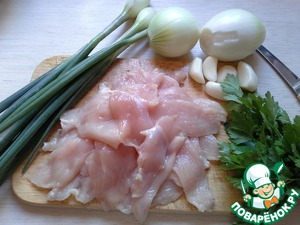 Нарезаем филе грудки как можно более тонкими ломтиками, солим, перчим. Подготавливаем лук, чеснок, зелень.