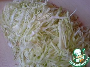 Капусту тонко шинкуем. Репчатый лук нарезаем очень тонкими четвертинками колец, а чеснок - тонкими кружочками, зеленый лук и петрушку мелко рубим.