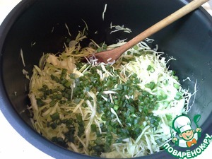 В режиме "жарка" растапливаем топленое масло и обжариваем сначала лук и чеснок, через 5-7минут выкладываем в чашу мультиварки нашинкованную капусту и зеленый лук, обжариваем еще 5 минут, постоянно помешивая.