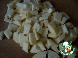 Репу нарезать и отварить до мягкости, переложить в блендер, добавить яйца, молоко и взбить, выложить в смазанную форму, запечь.