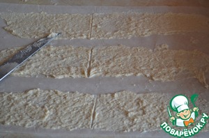 Включаем духовку на максимум. Слоеное тесто с пудрой аккуратно размазываем по бумаге для выпечке-вот такими длинными дорожками. Тонко-тонко. Затем, каждую дорожку аккуратно делим на части ножом. Это дорожки-основа для трубочек.