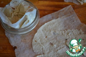 Вы можете сделать не трубочки, а корзиночки. Просто намажьте тесто примерно квадратиком, чуть потолще, чем на трубочки. Квадратики с тестом сложите в жаропрочные формы. Вот так.
