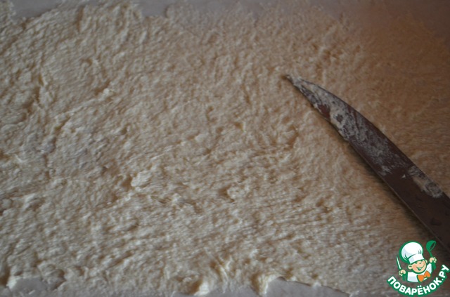 Тесто с пудрой размазываем шпателем или широким ножом по бумаге для выпечки. Включаем нагреваться до 220град. духовку. Размазываем тесто очень тонко. Это мы делаем с вами основу под печенье-тюиль. Технологию его приготовления я подсмотрела у Шефа Джонатана Вахида в книге Н. Белоцерковской "Гастрономические рецептыши".