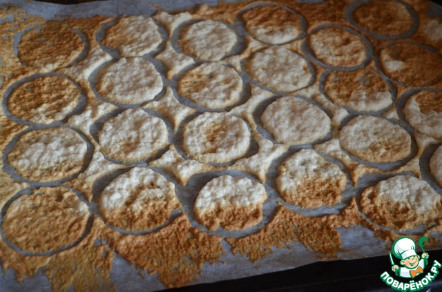 Вынимаем противень, остужаем. Тесто очень тонкой, очень легко крошится. Поэтому, оставьте его на бумаге, пока оно не остынет.