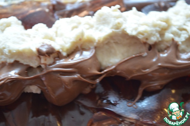 На него-дорожку сладкого риса и шоколадно-ореховую пасту. Аккуратно сворачиваем ролл. Прижимайте бамбуковым ковриком ролл, чтобы все ингредиенты прилипли друг к другу. Убираем в морозилку на 10-15мин.