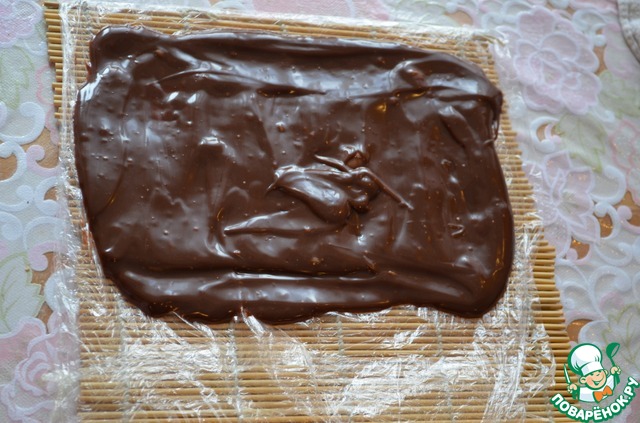 Шоколад растопить на водяной бане. Добавить 20мл сливок. Хорошо перемешать и аккуратно выложить на бамубковый коврик, застеленный пищевой пленкой.