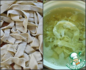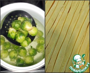 Брюссельскую капусту отвариваем до готовности и делаем из нее пюре. В пюре добавляем соль, муку и замешиваем тесто. Затем его необходимо накрыть и оставить на 20 мин. Когда наше тесто отдохнет, рабочую поверхность присыпаем мукой, раскатываем его в тонкий пласт, который нарезаем на узкие полоски. Лапшу необходимо подсушить.
