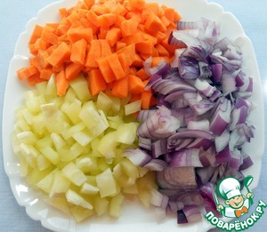 Морковь, болгарский перец, очищенный от семян, лук нарезаем небольшими кусочками.