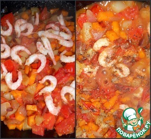 В сковороду наливаем немного растительного масла и слегка обжариваем там лук и морковь. Затем добавляем перец болгарский, помидоры, очищенные креветки, соль и перец по вкусу. Накрываем все крышкой и тушим на медленном огне до готовности.
