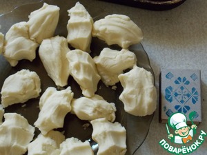 Через час тесто разделить на небольшие кусочки. У меня получается примерно 60-65 шт.