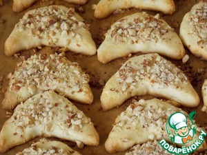 На противень положить пекарскую бумагу. На ней пальцами из каждого кусочка сформировать полумесяцы. Смазать взбитым белком и посыпать орехами.