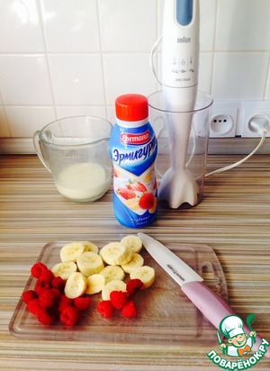 Итак нам понадобится банан, малина, йогурт, молоко и блендер для взбивания
