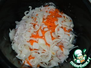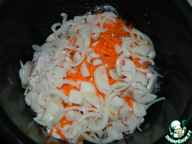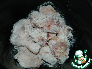 Курицу обваливаем в муке и выкладываем в чашу мультиварки, смазанную маслом.
