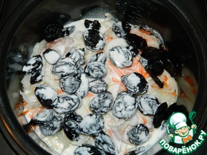 Выкладываем чернослив. Сметану разводим с горячей водой и заливаем курицу с черносливом. Готовим на режиме мультиварки "Выпечка" 1 час.
