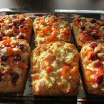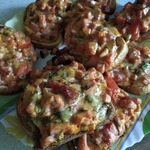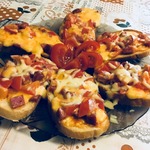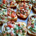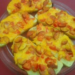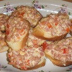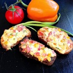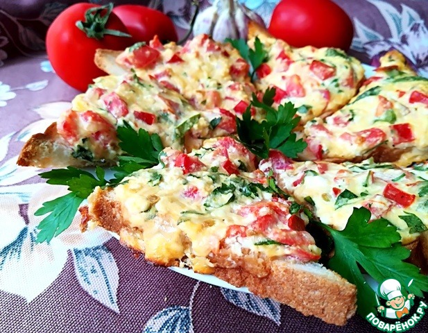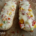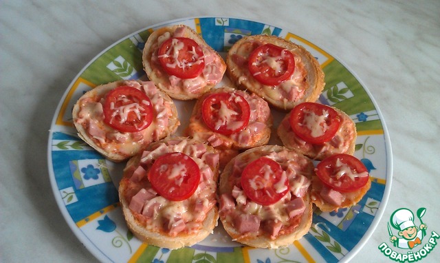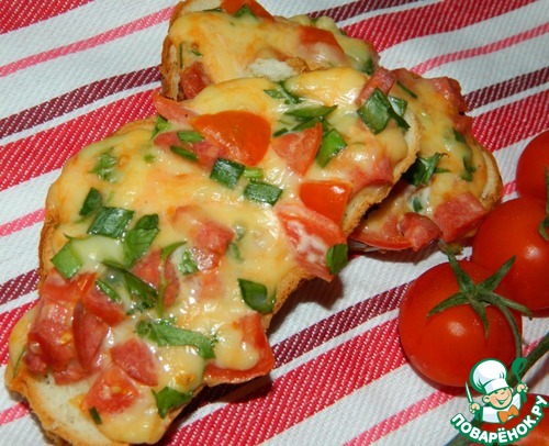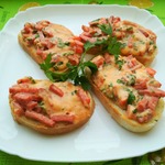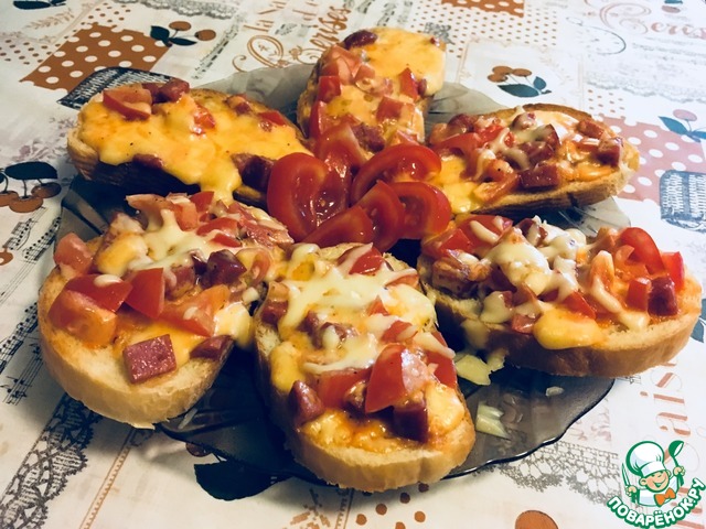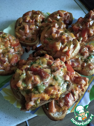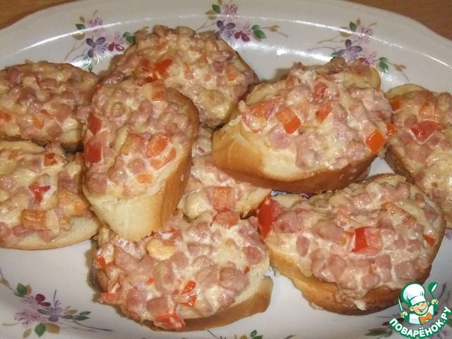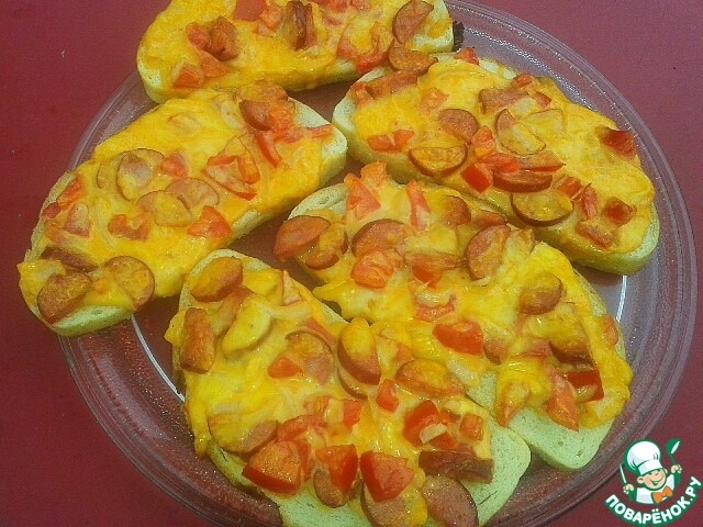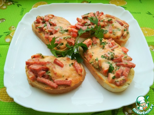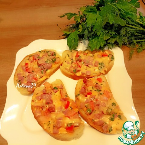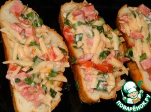 Выкладываем нарезанный батон. Сверху выкладываем начинку. Выпекаем горячие бутерброды в разогретой духовке при температуре 180 градусов 15 минут.
