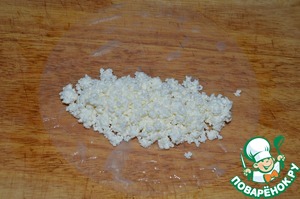 Творог хорошо смешать с сахарной пудрой, для однородности можно добавить пару ложек сметаны. Выложить 1,5-2 ст. л. на рисовую бумагу.