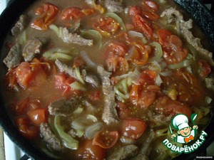 Консервированныe помидоры размять в кашицу и добавить в мясо, посолить, поперчить, залить водой и тушить до готовности.