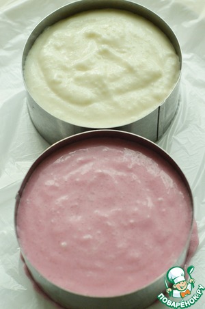 4. Массу разделить на 2 части. В одну добавить джем и свекольный сок. Выложить массу в 2 формы. Я застелила тарелку обычным пакетом, сверху поставила формы для гарнира и выложили рисовую массу. Убрать в холодильник до полного застывания.