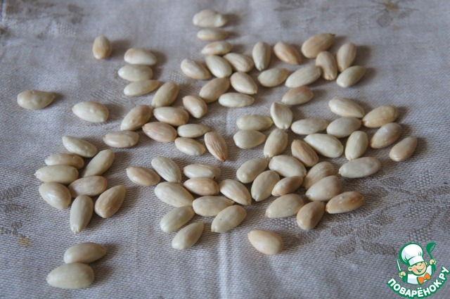 Миндаль зали ть крутым кипятком на 2-3 минуты, затем слитьт, обдать холодной водой и очистить от шелухи.