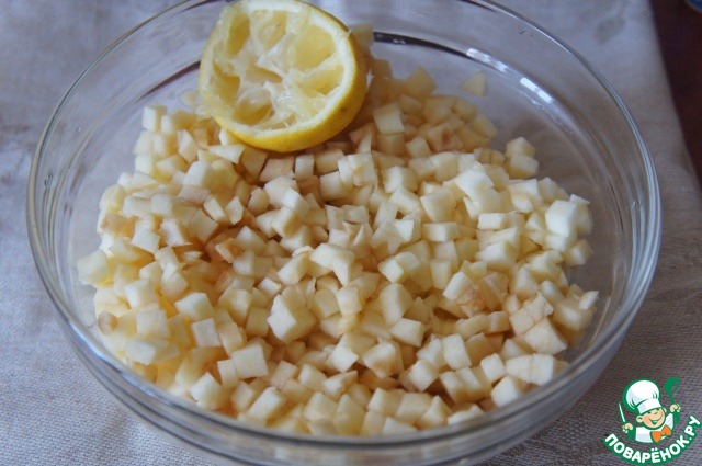 Яблоки мелко нарезать, полить соком, выдавленным из половины лимона, перемешать и отставить.