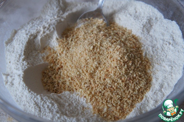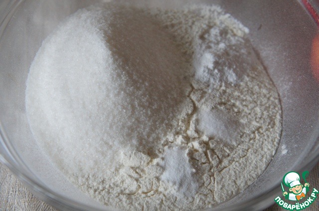Муку смешать с сахаром, солью, разрыхлителем и ванильным сахаром.