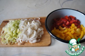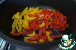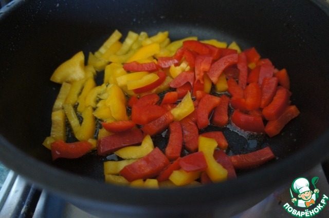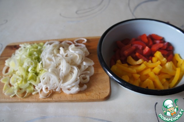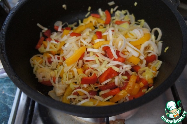 • Добавить порей и потушить буквально пару минут. Если использовать репчатый лук, то обжарить вместе перец и лук до золотистого цвета лука.