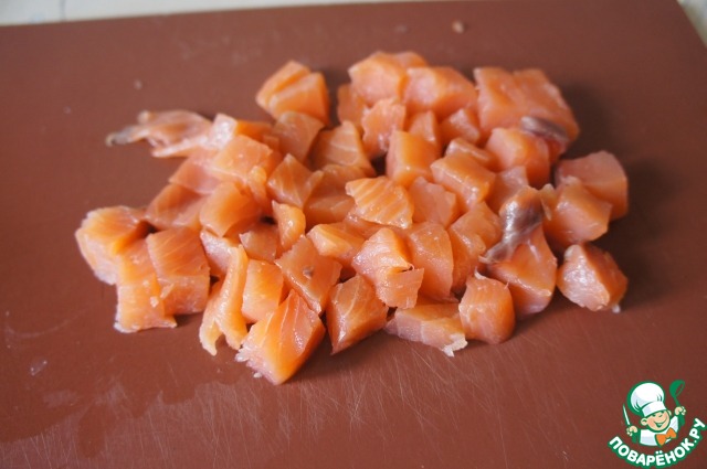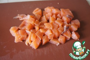 • Филе без кожи нарезать на крупные кубики (примерно 1.5х1.5 см) и отложить.
