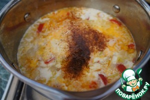 • На кончике ложки молотой паприки (для придания супу розоватого цвета) и белый молотый перец. Довести до кипения и варить на медленном огне до готовности.