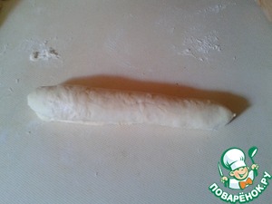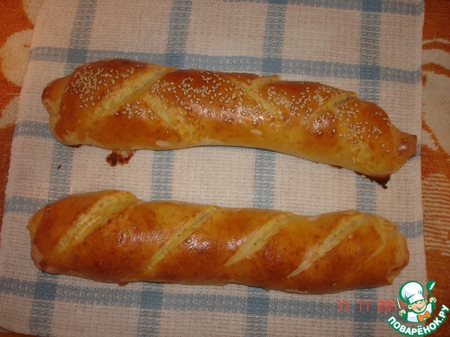 И ещё. Так как моя племяшка любит булочки с сосиской, то и в эти багеты решила добавить нарезанную соломкой или натертую на терке сосиску. Раскатать тесто, посыпать измельченной сосиской, завернуть в рулет. Ну а дальше всё по рецепту