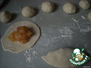 Разделить на шарики, раскатать, положить начинку, защипать и жарить во фри.