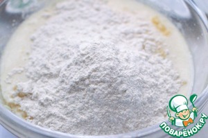 3. Затем влить кефир. сверху на кефир высыпать соду, когда сода зашипит, перемешать. Затем сверху просеять муку, перемешать.