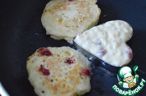 5. В сковороду влить масло, разогреть. Выкладывать небольшое количество теста и жарить оладьи на маленьком огне до готовности. Можно жарить с помощью железных форм для печенья. У меня сердечки.