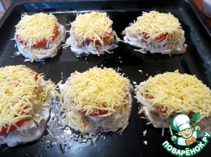 Сверху уложить помидоры, нарезанные тонкими кружками, посыпать сыром, натертым на мелкой терке.