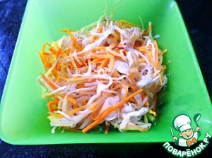 Итак, первым делом, очень мелко шинкуем капусту и натираем морковь на корейской терке. Заливаем двумя ложками яблочного уксуса и оставляем минут на 10 мариноваться.
