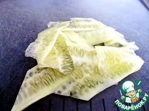 Тем временем огурец очищаем от кожуры и нарезаем очень тонкими пластинками.