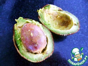 Авокадо у меня очень спелый и мясистый. Вынимаем мякоть ложкой и разминаем в пюре.