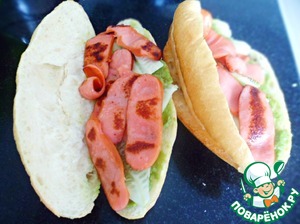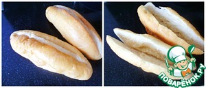 Теперь о багетах: здесь в ходу именно небольшие такие багетики, но есть и обычные длинные. В общем, за неимением маленьких (в России я таких не видела) можно взять один длинный и разрезать его вдоль пополам, не дорезая до конца.